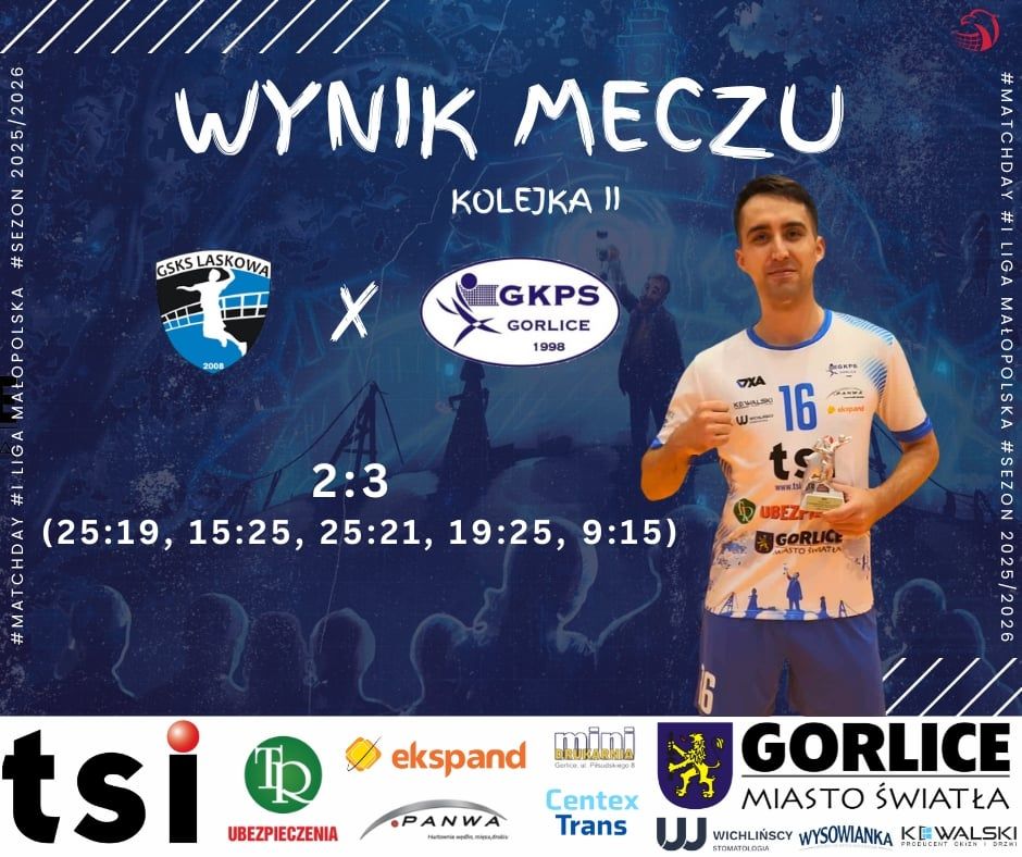W sobotni wieczór drużyna GKPS Gorlice odniosła cenne wyjazdowe zwycięstwo, pokonując po pięciosetowym pojedynku zespół GSKS Laskowa 3:2. Spotkanie dostarczyło wielu emocji i stało na wysokim poziomie sportowym. Pierwszy set lepiej rozpoczęli gospodarze, którzy dzięki skutecznej zagrywce i dobrej organizacji gry objęli prowadzenie, wygrywając 25:19.